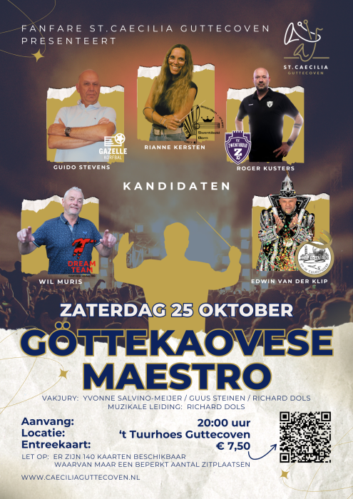 Op 25 oktober is ’t Tuurhoes het toneel van de Göttekaovese Maestro wedstrijd: 5 bekende Guttecovenaren – van de voetbalclub, de korfbalclub, het accordeonorkest, de Tuurhouters en het Dreamteam – strijden om de titel van Maestro.