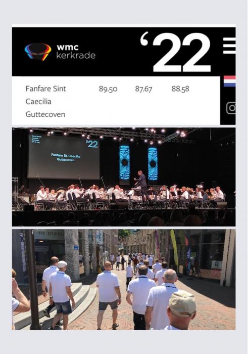Bij de deelname aan het WMC in Kerkrade op 23 juli jl. behaalde onze fanfare een mooie 1e prijs in de 1e divisie fanfares. De concertwerken 'Paradise Cave,' 'Rosymedre' en 'Of Distant Memories' werden beoordeeld met gemiddeld 88,58 punten.